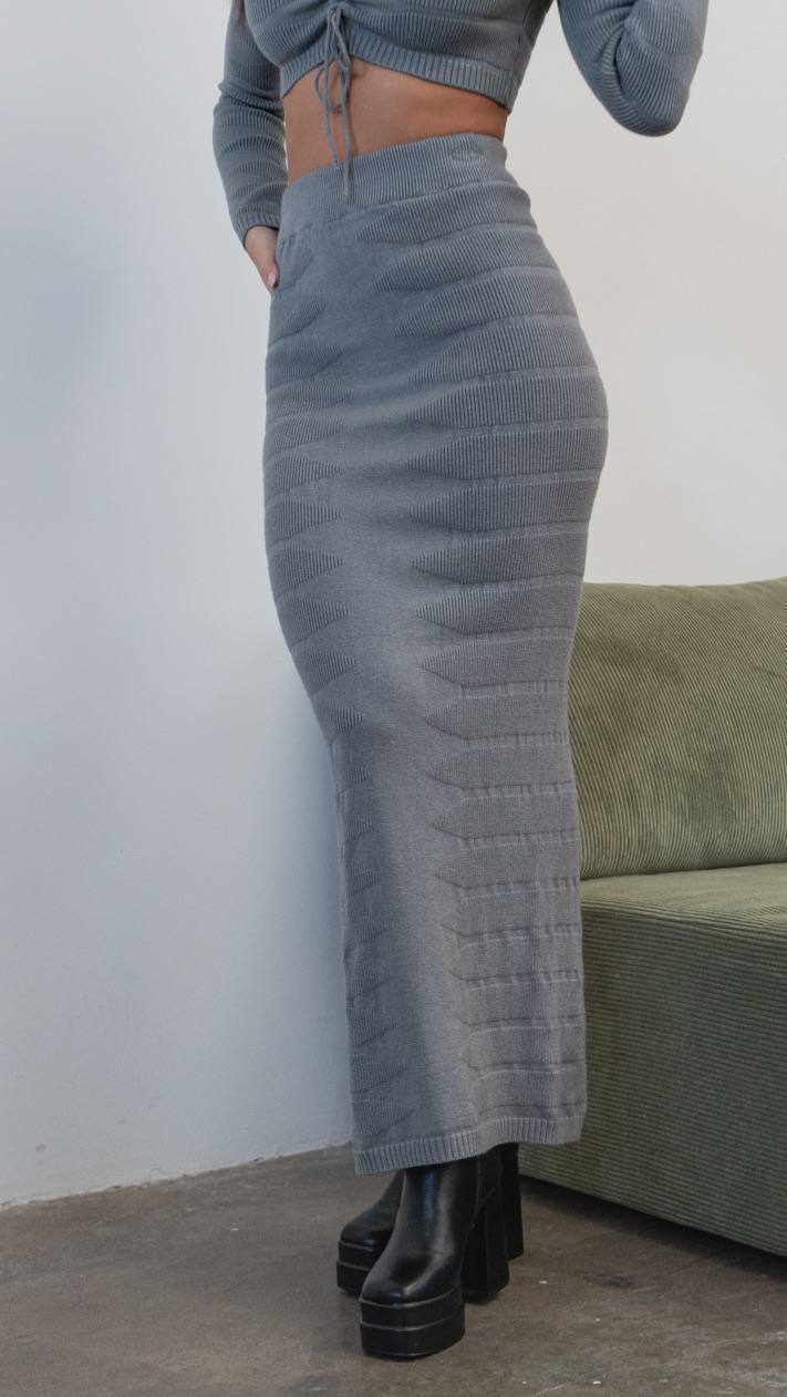 Incluye top de manga larga con frunce ajustable en el centro y falda midi de punto con abertura trasera, creando un efecto favorecedor y estilizado.