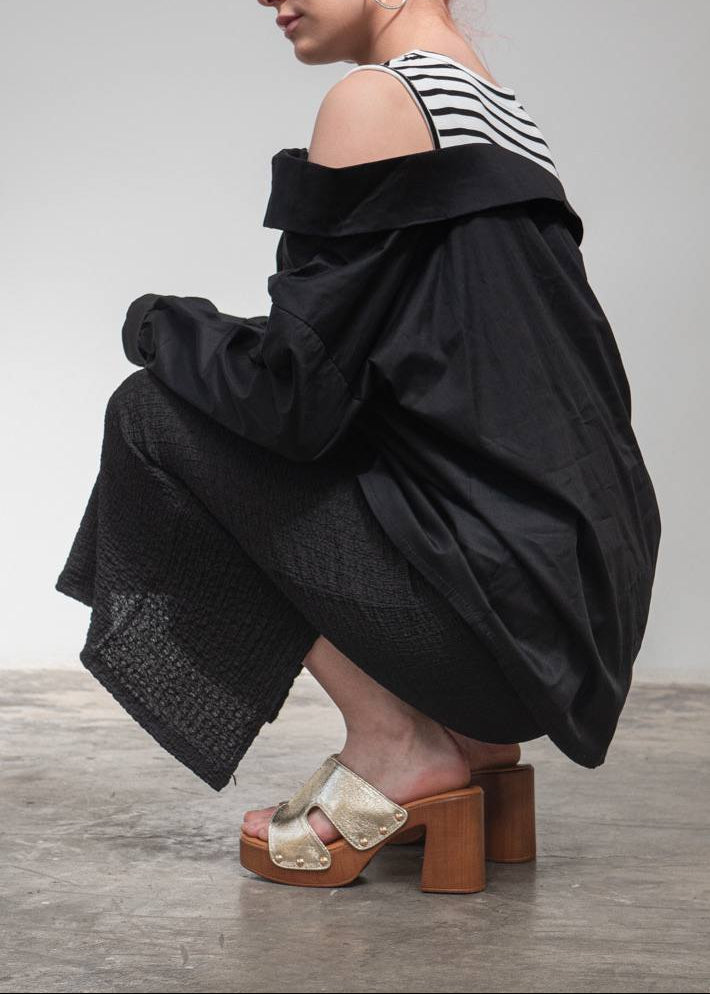 Una camisa negra con presencia propia. Su diseño de línea recta y tejido con caída la convierten en una prenda esencial, con ese toque elegante que no necesita más adornos para destacar.