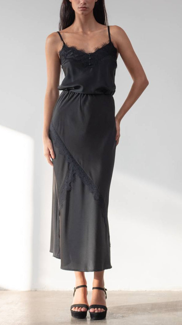 Elegante, sensual y con ese brillo satinado que capta todas las miradas. Su diseño estilo lencero con detalle de encaje en diagonal realza la figura y aporta un toque cómodo y femenino.