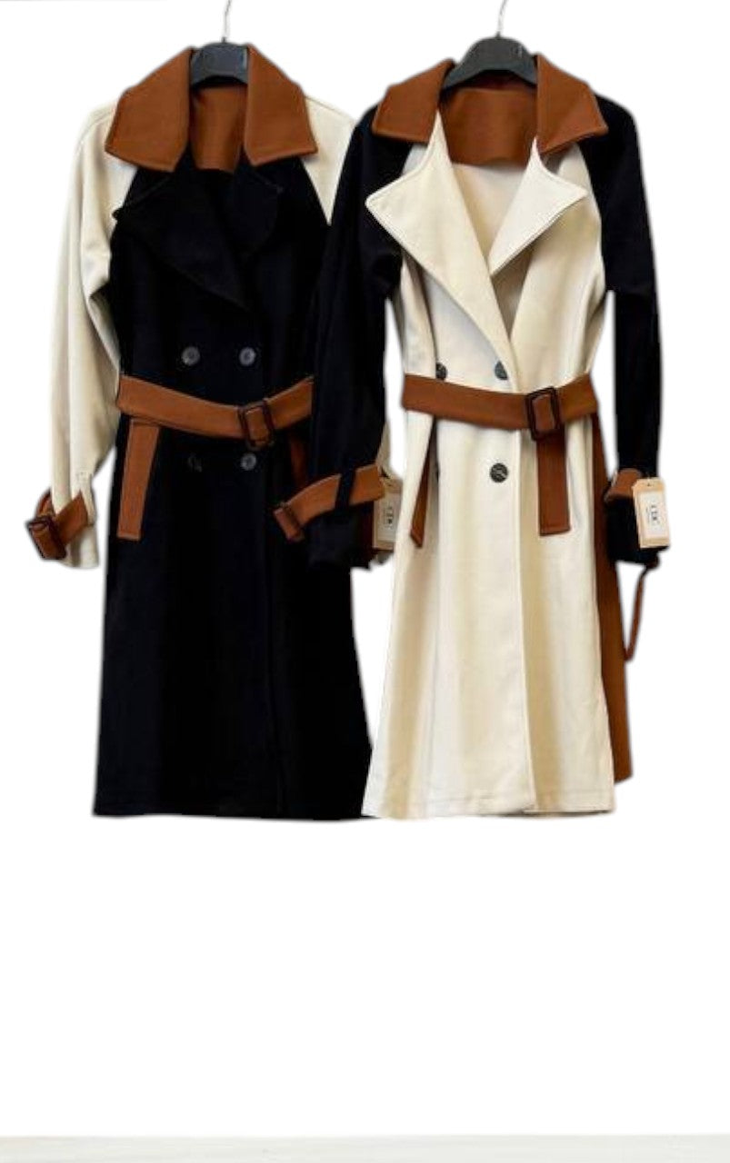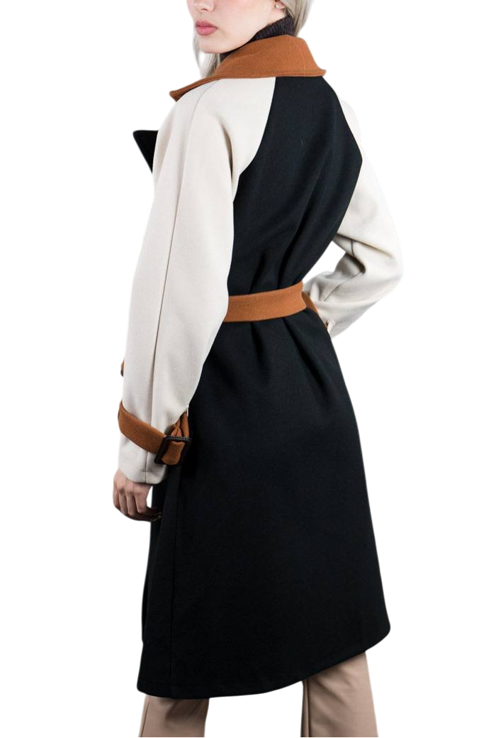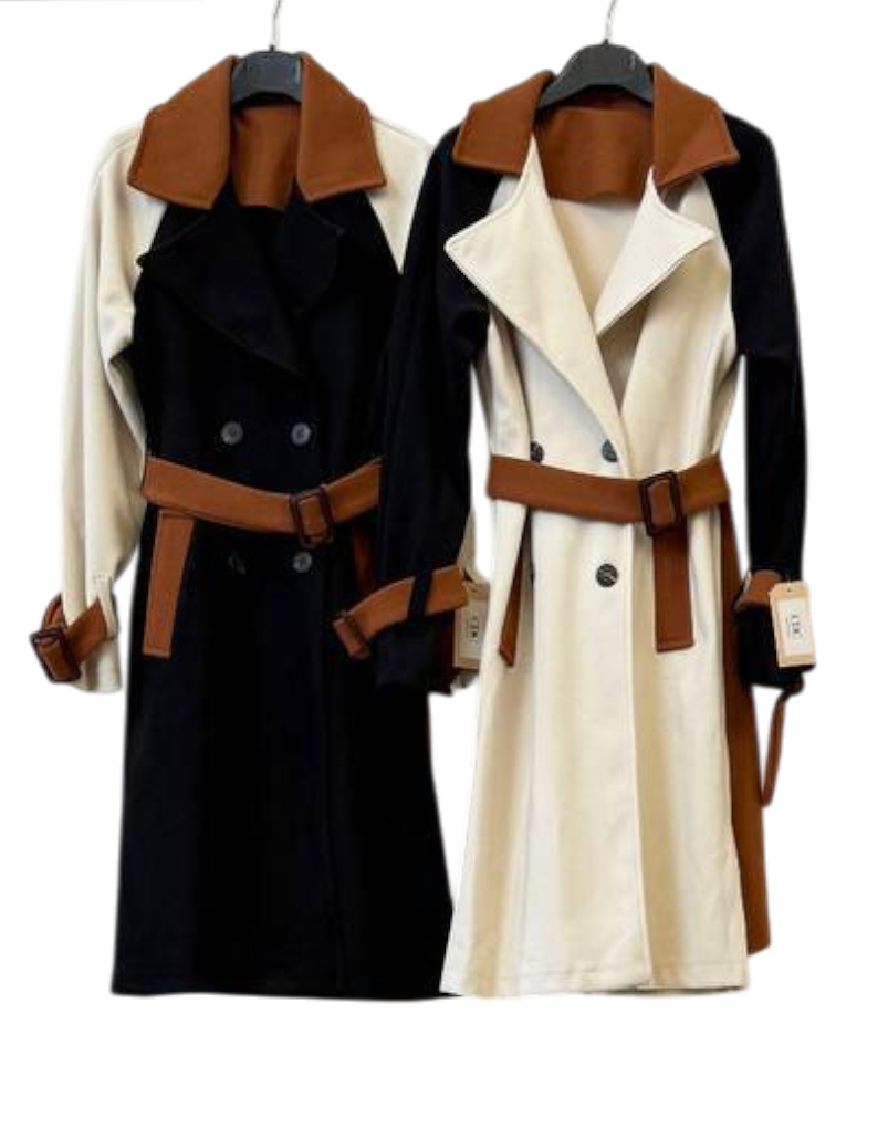 Sofisticado, moderno y con carácter. El abrigo Dama Contrastada es una pieza de paño suave que combina tonos tierra, crudo y negro en un diseño elegante y estructurado. Su corte tipo trench con doble abotonadura y cinturón ajustable resalta la figura con estilo y calidez.