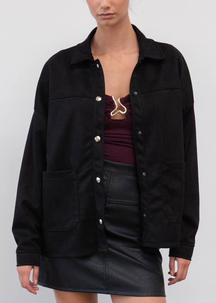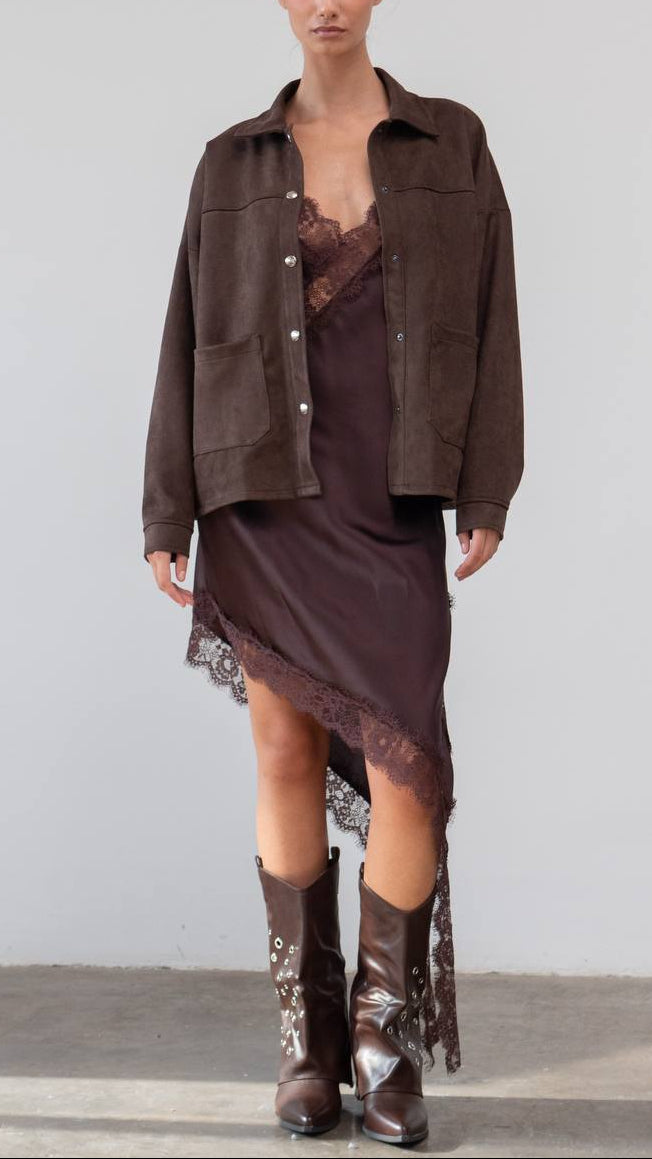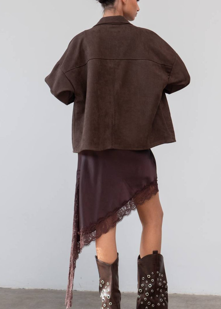 Esta sobrecamisa efecto ante con botones metálicos es el equilibrio perfecto entre casual y sofisticado. Su tacto suave, su corte relajado y sus colores tierra hacen que combine con todo: faldas, jeans o vestidos lenceros.