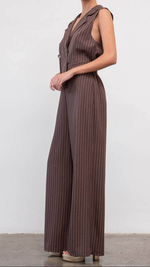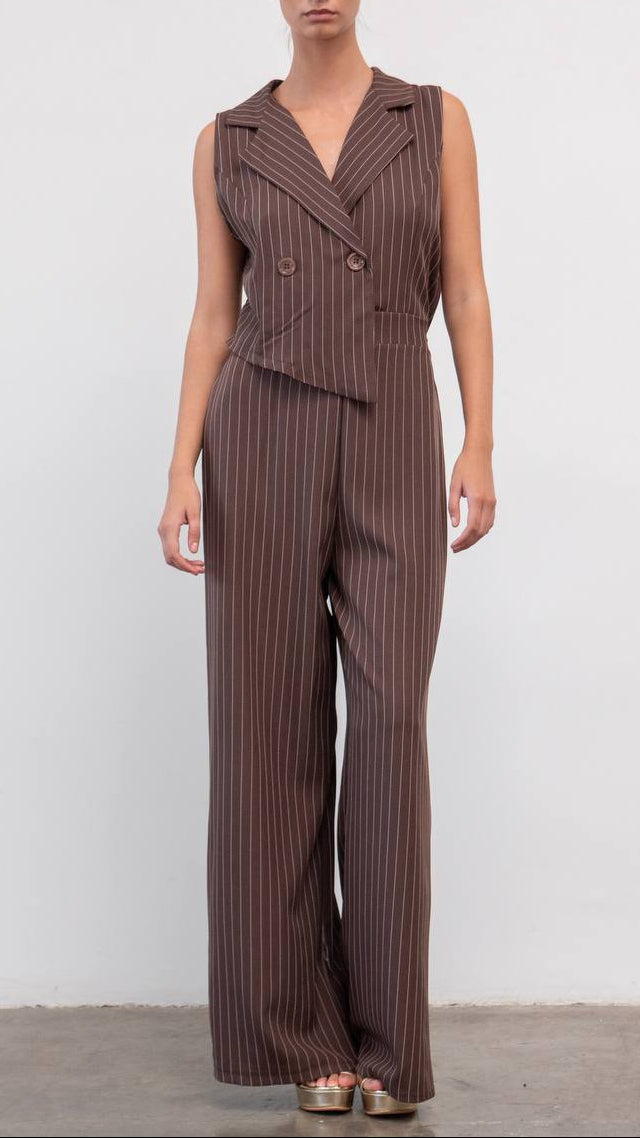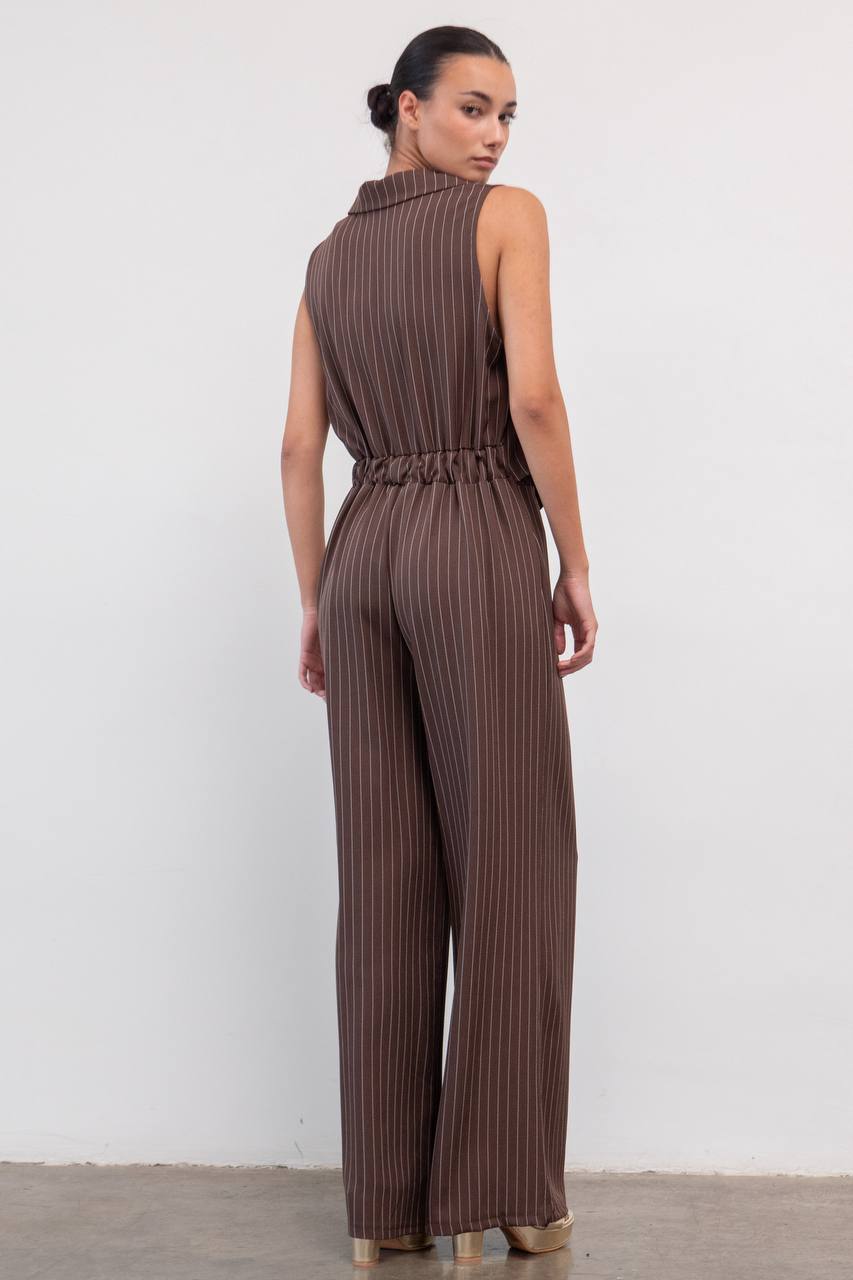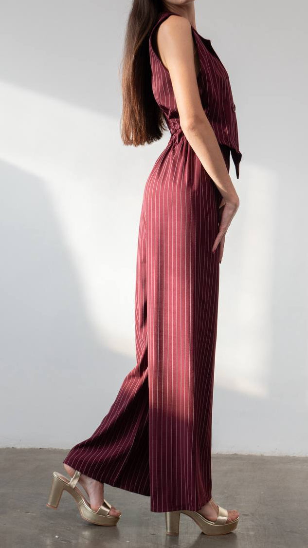 El Mono Línea Boreal combina el estilo de un traje sastre con la comodidad de una prenda fluida. Su diseño sin mangas y su corte recto estilizan la figura, mientras las finas líneas verticales alargan visualmente la silueta.