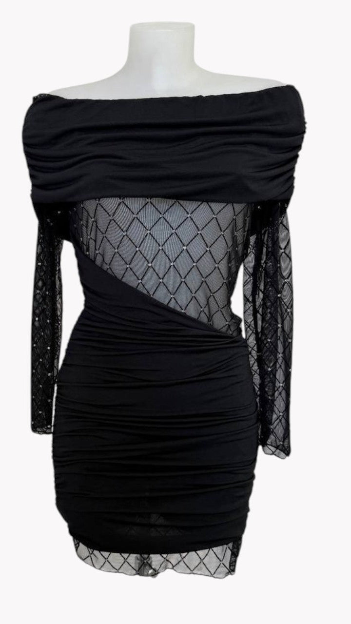 Su diseño con escote caído, mangas de tul bordado y detalles transparentes crea un efecto visual sofisticado que realza la figura. El fruncido lateral estiliza el cuerpo, aportando movimiento y una silueta femenina impecable.