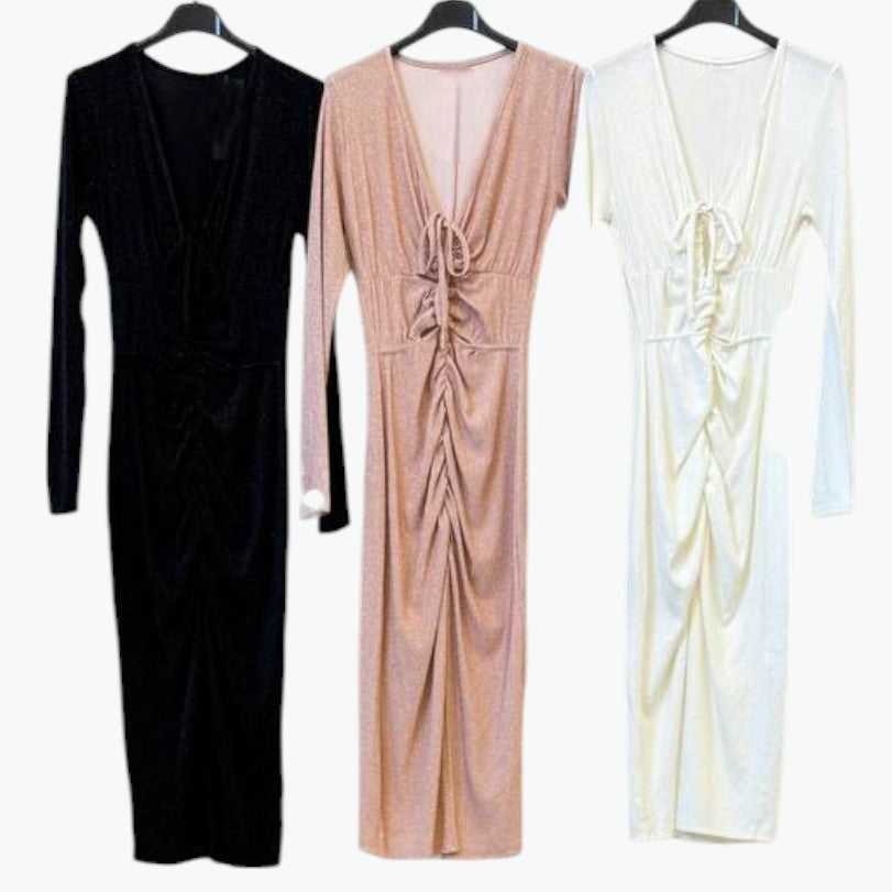 El fruncido delantero aporta movimiento y equilibra la figura, mientras la abertura frontal alarga visualmente las piernas.