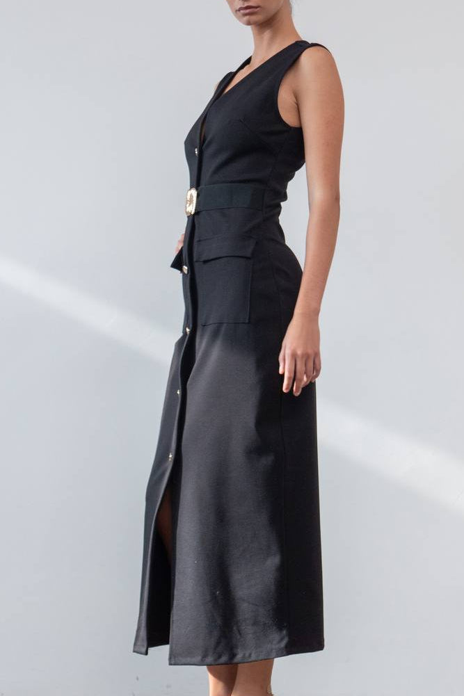 Diseño largo sin mangas con escote en pico, botones delanteros dorados y bolsillos XL con cinturón a juego que realza la figura con un toque sofisticado y actual.