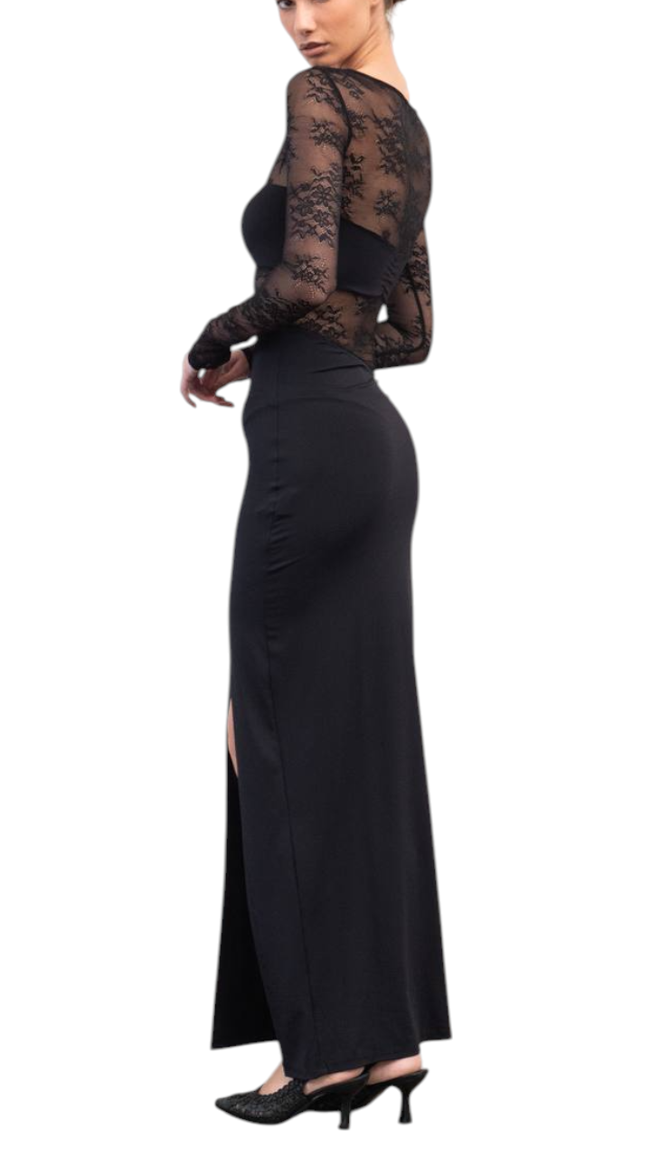 Un diseño que une elegancia y sensualidad con un acabado impecable. Este vestido largo de talla única está confeccionado en encaje floral semitransparente con un corte ceñido que realza la silueta. Las mangas largas aportan sofisticación, mientras que la abertura lateral añade un toque moderno y femenino.