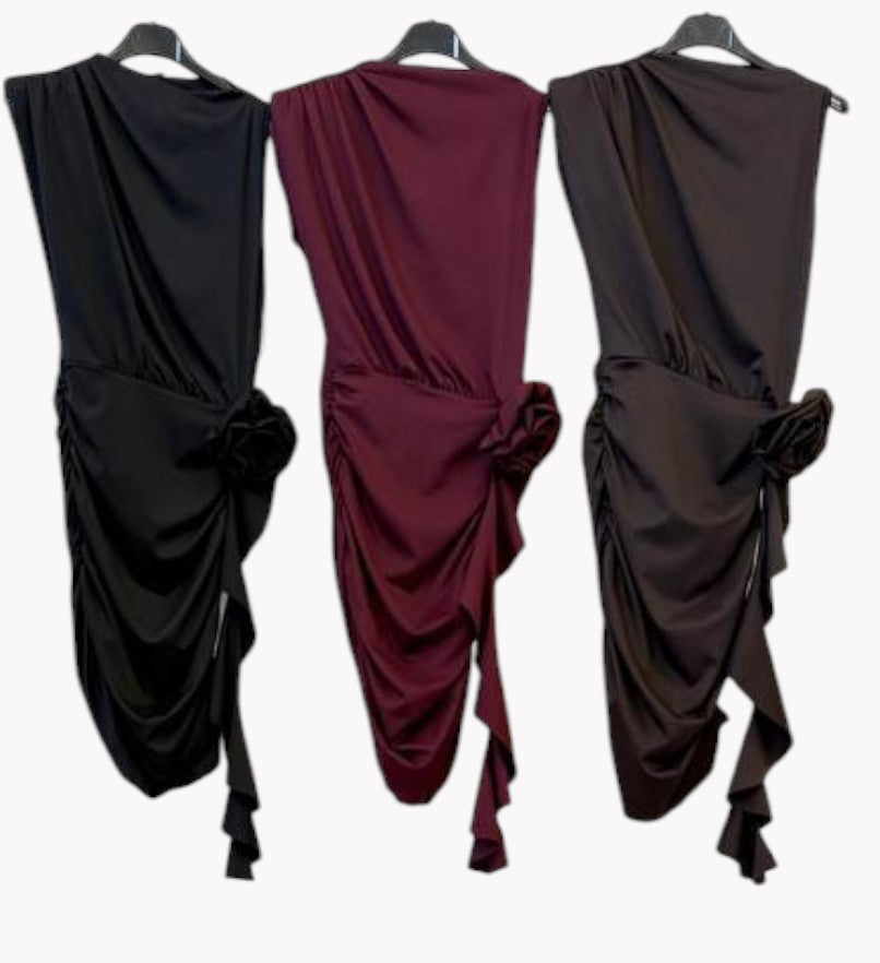 Destaca su drapeado lateral con una gran flor de tela 💐 que aporta un toque elegante y femenino.